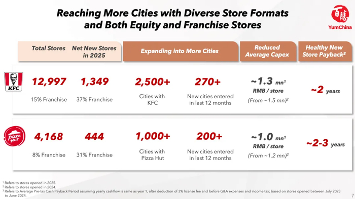 必胜客则通过增强性价比,并通过WOW门店模式,进入此前未覆盖的区域,尤其是在低线城市。业绩会材料显示,2025年,必胜客WOW扩展至约100个新城市。“新设的WOW门店餐厅利润率持续改善,投资回收期稳定在两到三年,与必胜客单店平均水平一致。” 丁晓说。