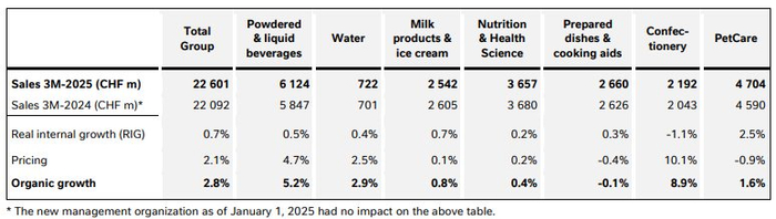 今天,雀巢集团发布2025年一季度成绩单。根据最新财报显示,今年前3个月雀巢总销售额同比增长2.3%至226.01亿瑞士法郎(2024年同期:221亿瑞士法郎),实现了2.8%的有机增长率,定价贡献率为2.1%,实际内部增长率为0.7%。