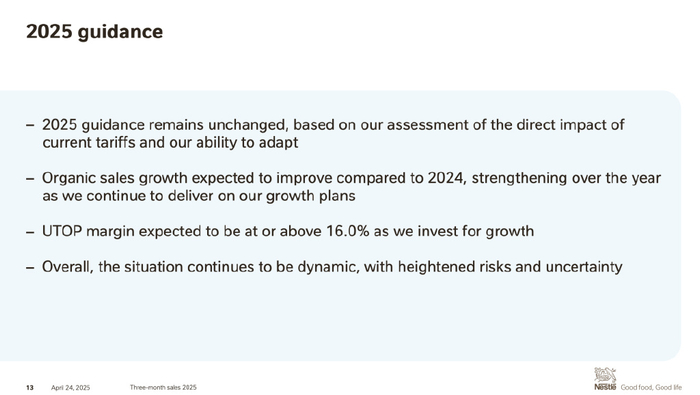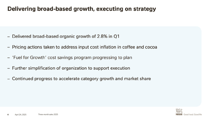今天,雀巢首席执行官傅乐宏在财报中指出,一季度业绩表现符合预期,雀巢2025年的指引保持不变,这是基于该集团对当前关税产生的直接影响及适应能力的评估。