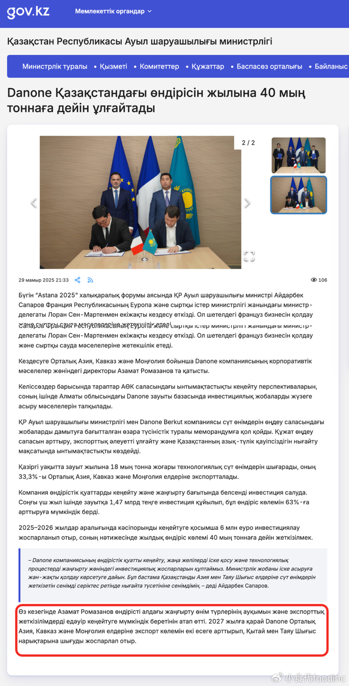 该工厂生产的新鲜乳制品以Activia、Danonino和Danissimo等品牌销售。哈萨克斯坦农业部在一份通报中(如下图所示)表示,到2027年,达能计划希望将该工厂对高加索地区、中亚和蒙古的出口量增加一倍,并开始向中东和中国发货。