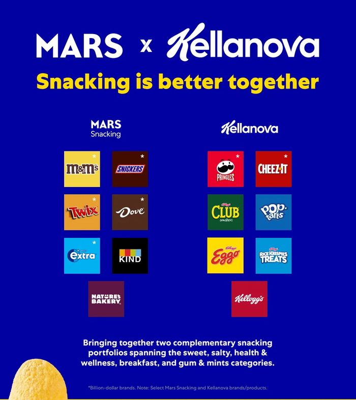 2025年12月,玛氏宣布正式完成对Kellanova的收购。旗下已拥有德芙、士力架、M&M’S、益达、皇家宠物食品等诸多品牌的全球食品巨头玛氏,与家乐氏和品客薯片的母公司Kellanova正式成为了“一家人”。
