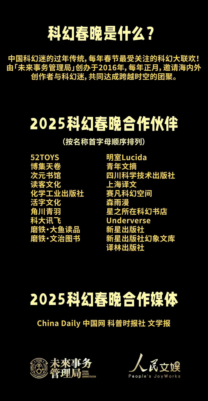 当时光的指针悄然指向2025年,“科幻春晚”作为中国科幻文学领域最具影响力与象征意义的文化活动之一,已步入具有里程碑意义的第十个年头。它为全球科幻作家提供了一个重要的跨文化交流平台,亦在深刻推动中国文化在全球语境中的多维拓展与深化。此次“上映”的11篇作品,作者多为中青年名家,创作群体涵盖中国、加拿大、澳大利亚、日本等多个国家,体现了该平台在全球科幻文学生态中的包容性与国际性。从社会历史变革叙述到微观个体情感与命运的探讨,春晚作品在形式与内容上体现了多元叙事视角与创新表现手法的交融,试图绘织出潜藏于我们现实生活之外的奇异景观——这些景观既是对人类未来命运的探稽,也是对当前社会状况的隐喻性映照。