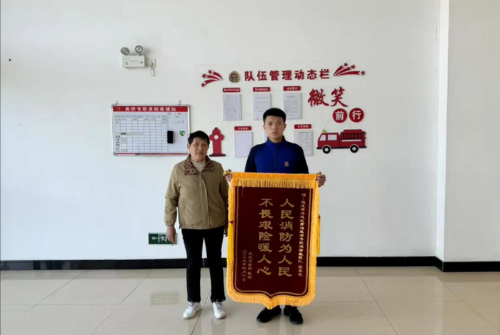 2025年清明节当天,一名男子因酒后骑行不慎摔倒,后脑着地,鲜血直流。围观群众束手无策时,恰好路过的殷嘉晨又一次挺身而出。他一边立即组织群众协助报警、寻找棉签纱布,一边为伤者做简单包扎,同时不断拍打其脸颊、与其说话,防止其昏迷。这一守,就是半个多小时,直到120到场。事后伤者家属送来锦旗,上面写着“人民消防为人民 不畏艰险暖人心”。他说:“其实,这些事,换做我们队的任何人,都会这么做。”