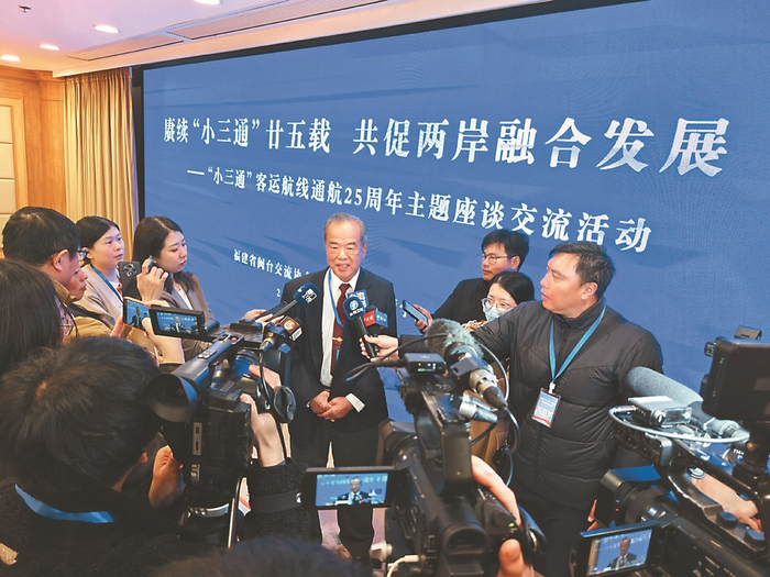 首次“小三通”直航亲历者、金门红十字会荣誉会长王水彰昨日在“小三通”客运航线通航二十五周年主题座谈交流活动现场接受采访。 新华社记者 许雪毅 摄