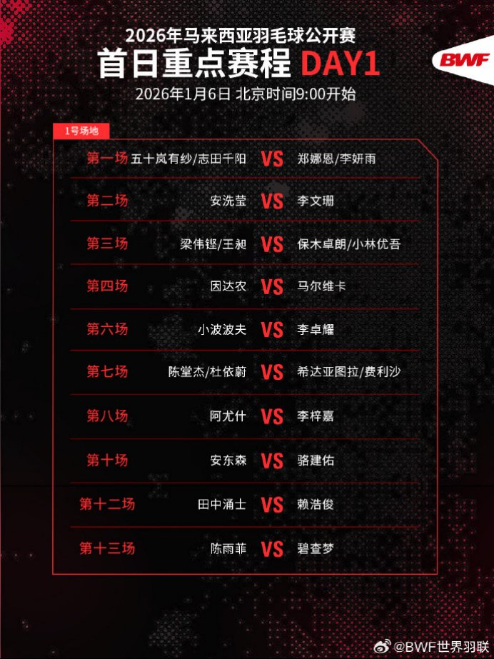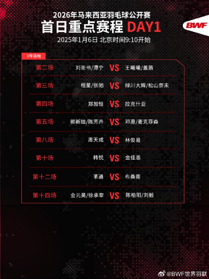 2026年世界羽联世界巡回赛超级1000赛事——马来西亚羽毛球公开赛于北京时间1月6日正式打响。来自江苏的运动员石宇奇、陆光祖、高昉洁、陈柏阳、黄荻随队参赛。