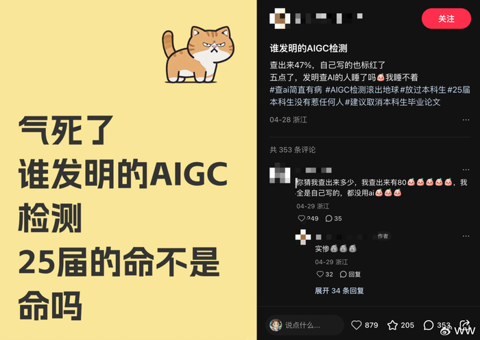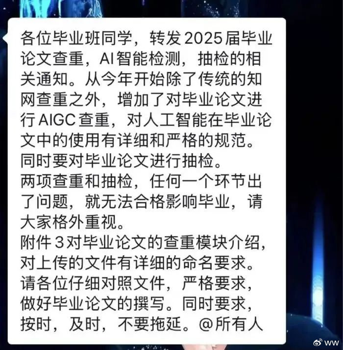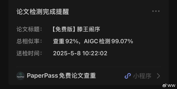 我其实一直都很赞成AI的快速发展,很少会看到,让我眉头一皱的AI应用场景。甚至会有点出离了愤怒。因为可能本心是好的,但是这个方法,却把好心,变成了一个让我非常痛心却又觉得无奈的事件。这个事情就是,马上毕业季了,很多的学校,为了整治学术不端行为,所以对学生们的论文,除了原来的查重检测之外,引入了AIGC检测。大概就是用一些所谓的AI检测工具,来检测你的论文里,AI生成的含量有多少。如果你的AIGC检测比例,如果高于一定的指标,就会无法毕业。
