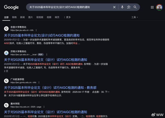 不止一个,还有很多。如果你去Google上搜一个关键局:关于2025届本科毕业论文(设计)试行AIGC检测的通知。你就能看到,大概有哪些学校,在开始实行AIGC检测了。