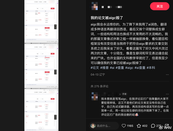 你如果去小红书在看看,搜索关键词:AIGC论文。能搜到一大堆的吐槽贴,还有掺杂在里面想捞一笔的所谓几款钱降重的广告。