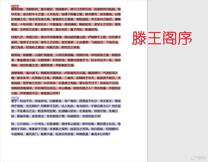 但是等等,关键那AIGC检测,说《滕王阁序》的AI生成度疑似74%啊。