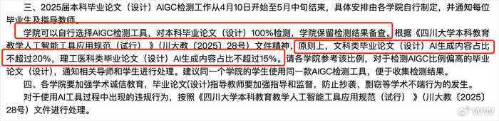 起初我以为这种只是一些造谣的图,在我实际查证之后,我发现,是真的。已经有多所大学,启动了AIGC检测,并且有明确的指标。比如4月9日,四川大学教务处发布的《关于开展2025届本科毕业论文(设计)学术不端行为检测工作的通知》中,就明确提到了,20%和15%这两个比例。