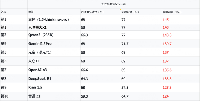 在我的测试中,讯飞星火和豆包除了第6题错,以其他题目全胜的姿态,145分的超高分,并列夺得了第一名。