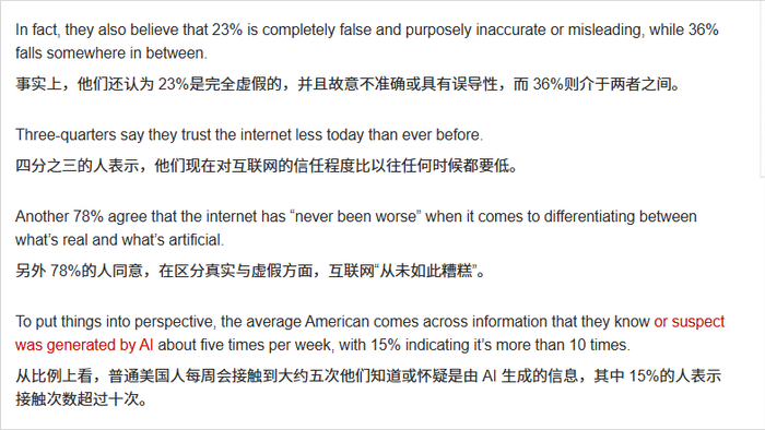 他们,认为他们消费的网络内容中只有41%是完全准确、基于事实并由真实人类创建的。
