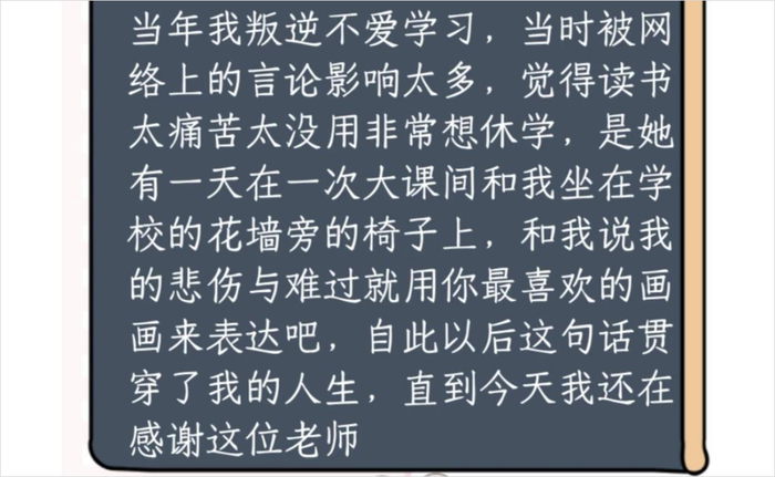 选择画画的原因很简单,唱歌跳舞画画她都喜欢,但画画是唯一坚持下来的一个爱好。