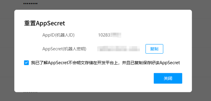 一定要存下来,因为你点击关闭以后,你的机器人密钥,就再也看不到了,下次只能重置了。