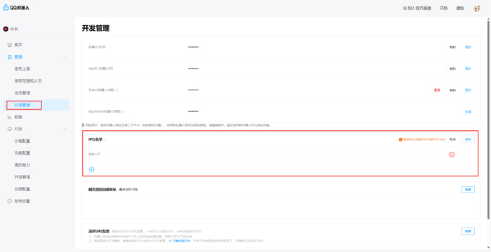 在QQ机器人的开发管理,IP白名单这,我们要给他配置一个IP。