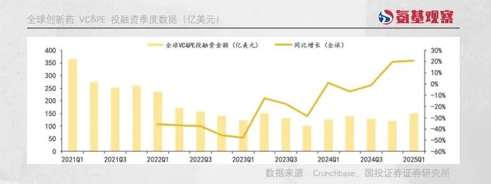 2025年一季度,全球市场创新药VC&PE投融资增速继续同比改善明显。Crunchbase数据显示,全球创新药VC&PE投融资金额同比增长20.57%。同时,基于眼下二级市场创新药板块的热度来看,投融资持续改善的趋势,延续的概率也比较大。