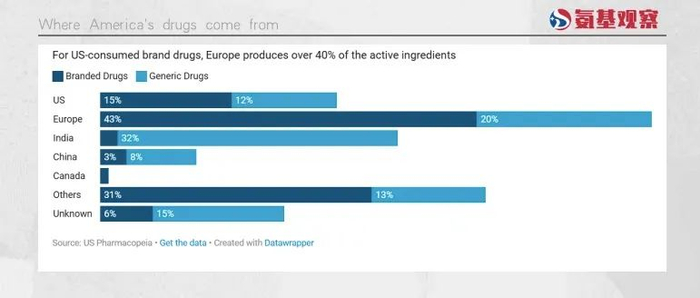 因为许多品牌药物的部分生产,都在欧洲完成。根据Endpoints、Reuters等权威媒体的最新报道,美国约85%的品牌药物依赖于其他国家的原料供应,主要依赖于欧洲(约43%)。譬如许多人也许不了解,爱尔兰凭借其较低的企业税率,一直是重磅药物活性成分生产的重要枢纽,其中包括礼来公司的减肥注射剂Zepbound和默沙东的K药。而印度和中国分别仅供应2%和3%的品牌药物API。
