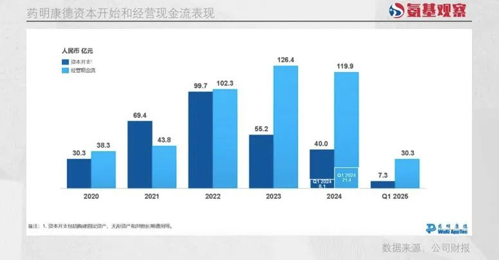 另一方面,净利润、现金流都和营收增速保持一样的趋势,现金流增长几乎与净利润同速。根据披露的数据,药明康德一季度经营现金流30.3亿元,同比增长41.8%,同样创下历史新高。这两个数据说明,药明康德并没有牺牲利润、现金流换取增长。