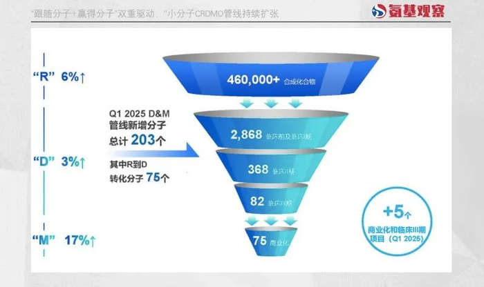 上述逻辑,在过去已经充分体现,而在2025年一季度得到了进一步的证实。具体而言,CRDMO模式引流能力持续提升,R端合成小分子数为46万个,增长了6%;同时,漏斗效应也在不断显现,药明康德小分子管线R到D转化分子数共计75个,占D和M环节所有新增分子的比重达到36.9%。