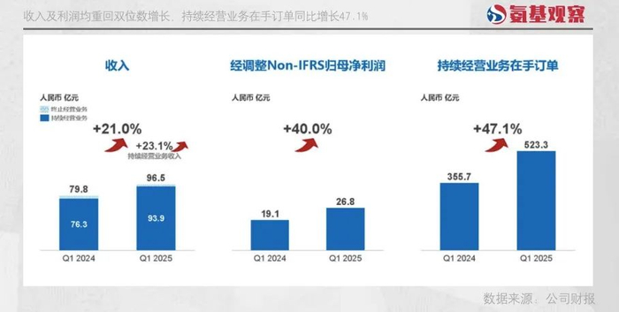 具体而言,药明康德一季度营收达到96.5亿元,同比增长21.0%;经调整non-IFRS归母净利润26.8亿元,同比增长40.0%;持续经营业务在手订单 523.3亿元,同比增长47.1%。