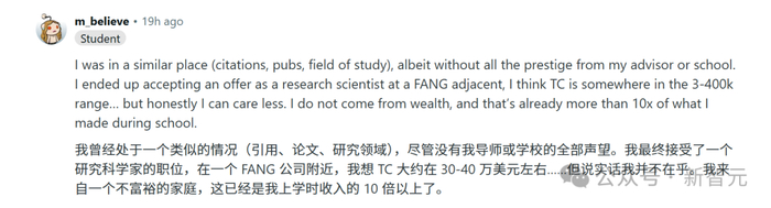 最终,他接受了一家公司的研究科学家offer,年薪大概在30-40万之间。