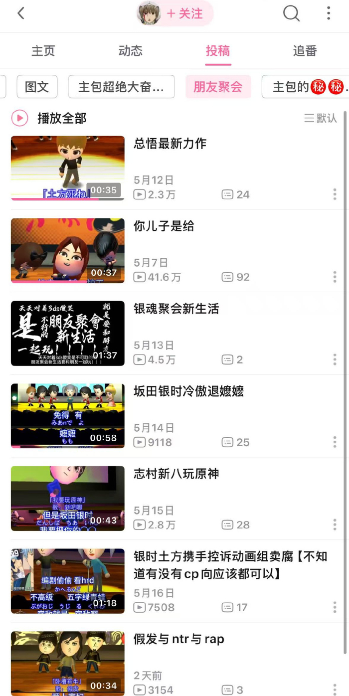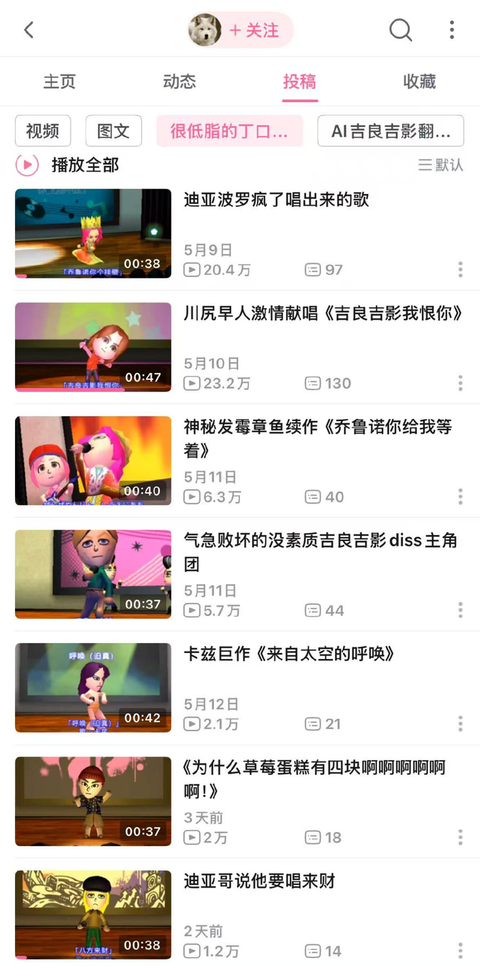 当角色厨和ACG作品粉丝也加入这场二创热潮,局面更是一发不可收拾。在B站UP“梣沫”首页能看到JOJO各路角色齐上阵劲歌热舞。