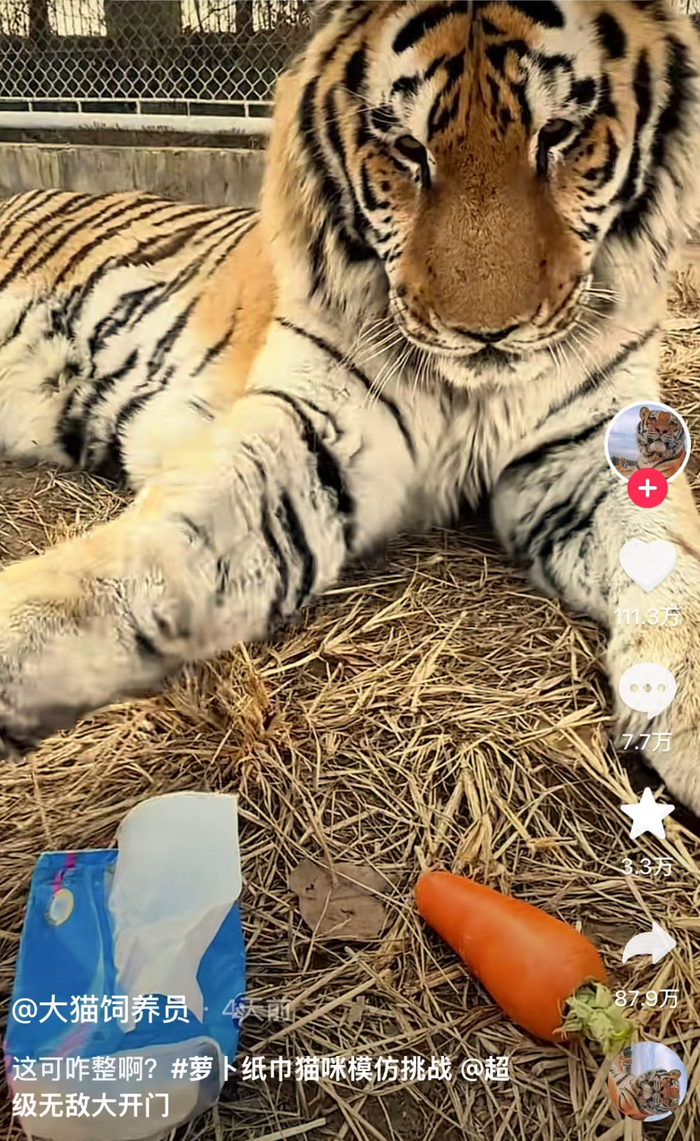 眼下,#萝卜纸巾猫咪模仿挑战#话题在抖音已经累积2.5亿次播放,其中能看到各地方文旅、冲浪好手多邻国、游戏博主等来自各领域的创作者加入。