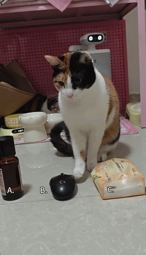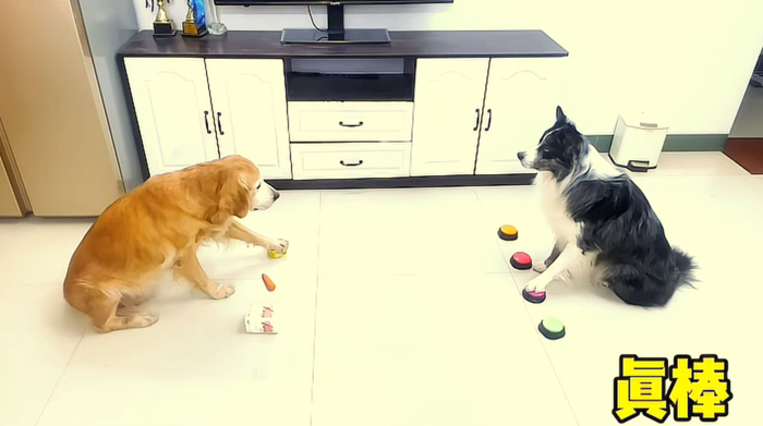 后来主人又带着开门学习“胡萝卜”“米老鼠”两个新指令,并尝试在同一场训练里加入多个指令。开门那小小的脑袋并没学进去多少东西,却意外摸索出一套简单粗暴的解题方法:把面前的东西全都摸一遍就能得到吃的。