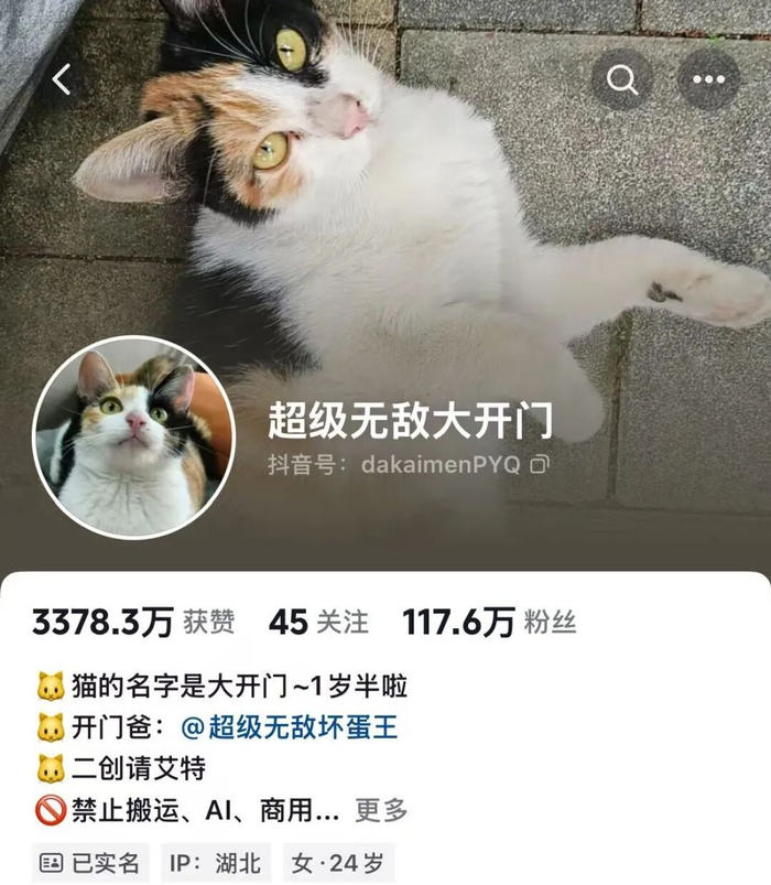 简单介绍下,“真棒猫”原名“大开门”,是抖音博主@超级无敌大开门喂养的一只貌美三花。此猫能从互联网万千萌宠中成为新晋顶流,全靠那项特殊才艺“听指令辨别物品”。