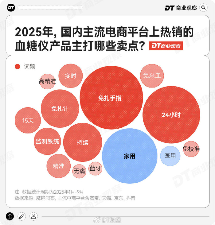 根据魔镜洞察的数据,在2025年国内主流电商平台上,动态血糖仪的卖点高度集中于产品功能与适用场景,“免扎手指”“24小时持续监测”“实时”以及“精准”等关键词高频出现。