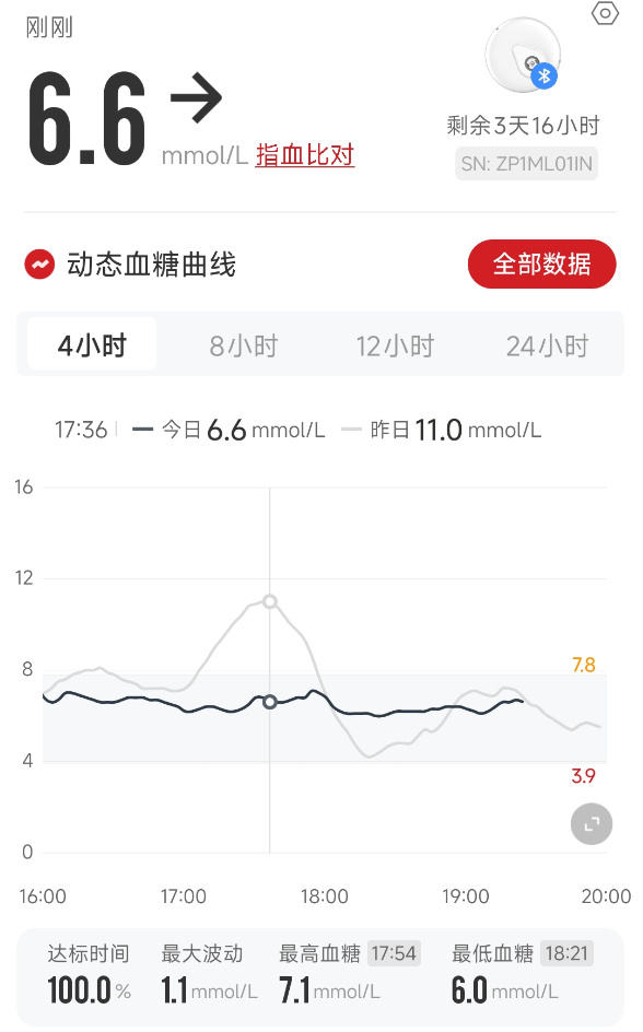出于对自身血糖的好奇,刚戴上动态血糖仪没两天的@羊对《DT商业观察》感叹,虽然体检显示自己的血糖没什么问题,但自从戴上这个硬币大小的东西,餐后查看实时血糖曲线已经成了她的一种生活习惯。