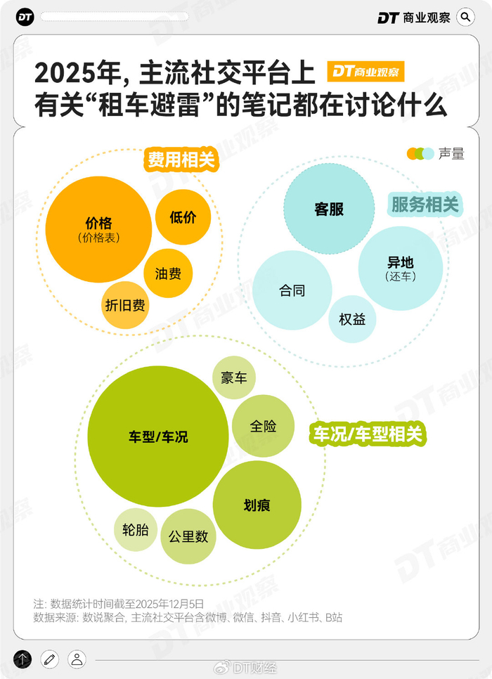 根据数说聚合,2025年主流社交平台有关“租车避雷”的笔记,诸如押金不退怎么办、价格表不准确等费用相关问题,以及车型、划痕、轮胎等车况相关的问题,还有客服电话打不通、异地怎么还车等服务相关的内容都是租车用户的核心关切。