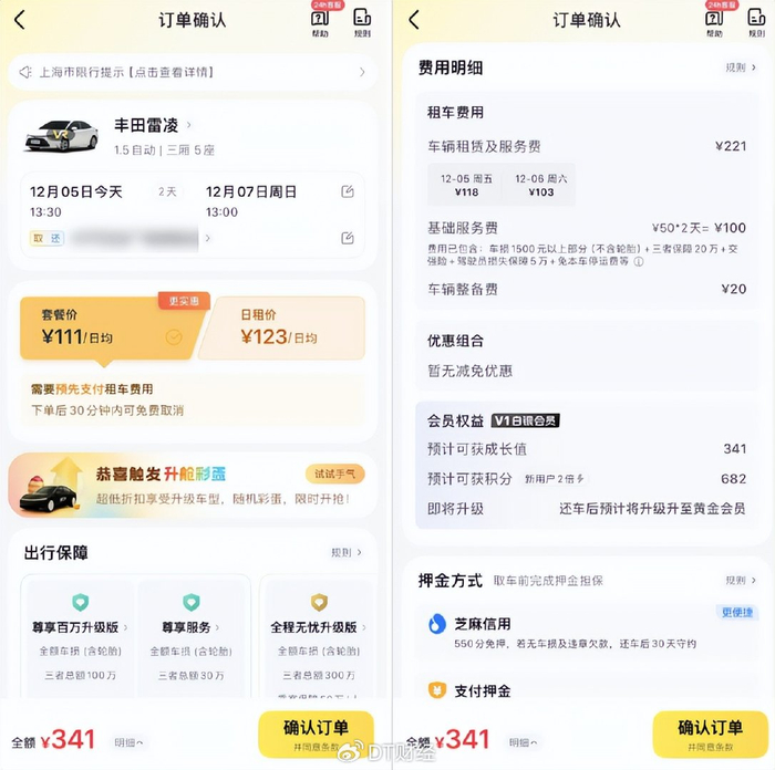 例如,在神州租车APP上,租两天经济型的丰田雷凌,预订时显示的全额341元,就是最终支付价格。这个价格包含车辆租赁及服务费、基础服务费、车辆整备费,在取还车时也不会再冒出新的“清洁费”或“手续费”。
