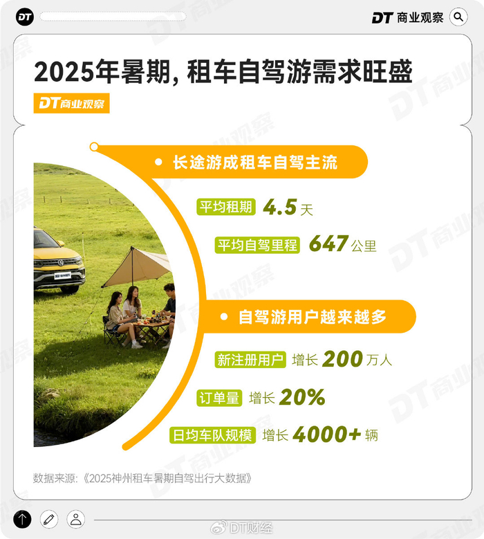 神州租车数据显示,2025年暑期租车订单量创历史新高,同比上涨超20%,仅新注册用户就增加200万人,车队规模新增4000多辆,以应对激增的需求。