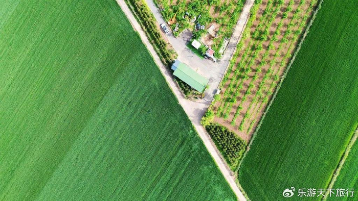 从空中航拍的角度就可以看出,中江兆村绿油油的麦田更像是绿色的背景布,黄色的土路,灰色的民居,绿色的大树,点缀在其间,果然是以田作“画布”,秧苗作“颜料”,整片大地都被充满生机的绿色渲染。