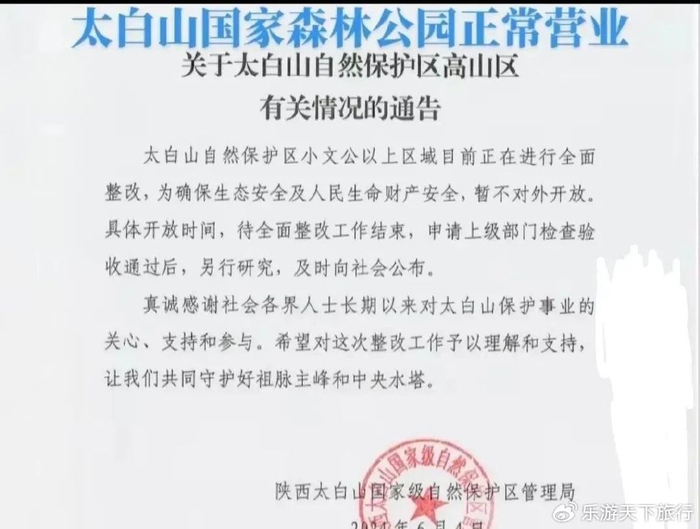 早在去年(2023年)8月28日,太白山景区就发布公告称:从2023年8月28日起,太白山景区游览范围开放至天圆地方景点,对高山区域(小文公、大文公、大爷海等景点)实行封闭,所有游客禁止进入该区域。