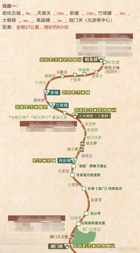 线路一:昭化古城到剑门关,全程27公里,用时9小时。