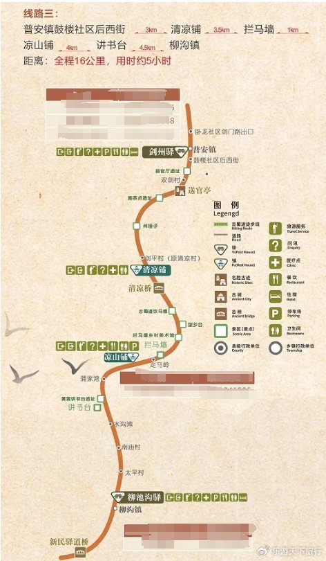 线路三:普安镇鼓楼社区后西街到柳沟镇,全程16公里,用时5小时。