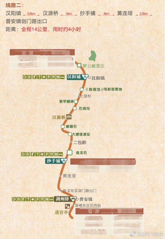 线路二:汉阳镇到普安镇剑门路,全程14公里,用时4小时。