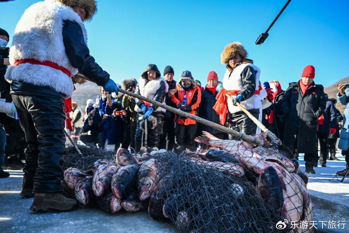 游客更可以观看并参与堪比查干湖盛大仪式的镜泊湖冬捕,渔民们举行萨满祭湖仪式后,用传统方法在冰面上凿洞、下网、收网,最终万尾鲜鱼破冰而出,场面沸腾。游客可以体验“冰上拔河”(拉网)、现场购买“头鱼”(寓意吉祥),并立刻品尝最鲜美的“湖水炖湖鱼”。