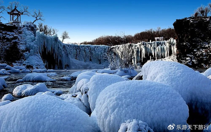 夏季气势磅礴的吊水楼瀑布在冬季完全冻结,形成巨大的冰帘、冰柱和冰幔,落差近20米,蔚为壮观。这是镜泊湖冬季的标志。