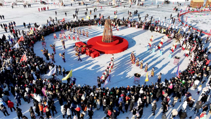 镜泊湖还是中国火山岩湿地冰雪渔猎文化 的代表地。冬季的萨满村落还原了古老的渔猎部落生活场景。