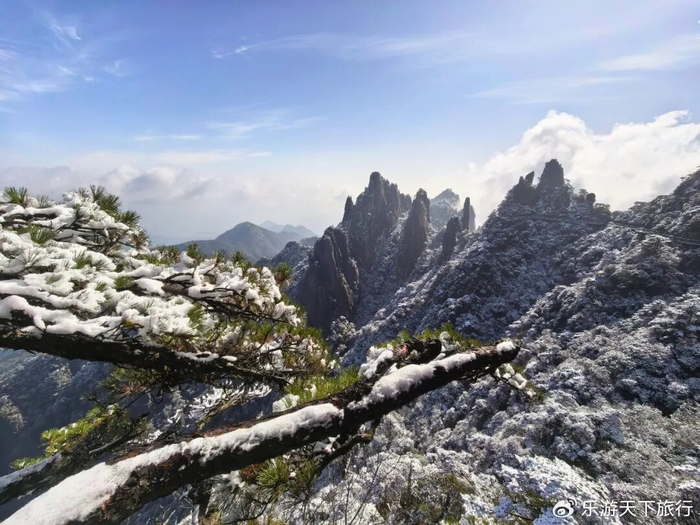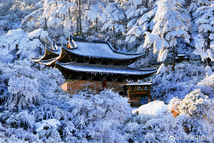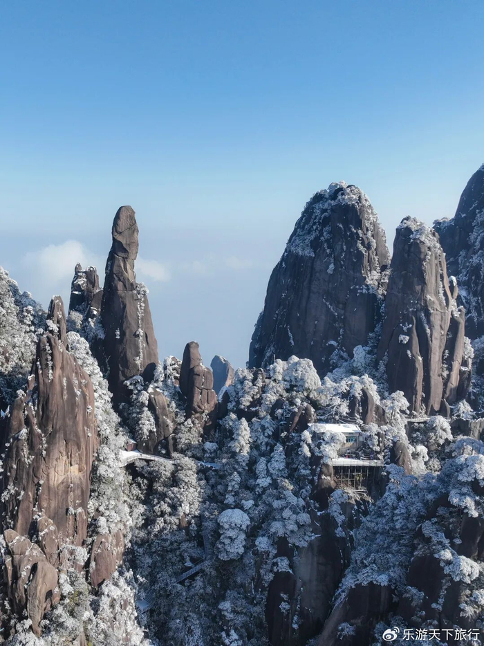 三清山的12 月 — 次年 2 月为旺雪期,花岗岩峰林与古松被冰晶包裹,女神峰、巨蟒出山等标志性景观更显空灵;即便无雪,高海拔低温也常形成雾凇,比雪更通透。