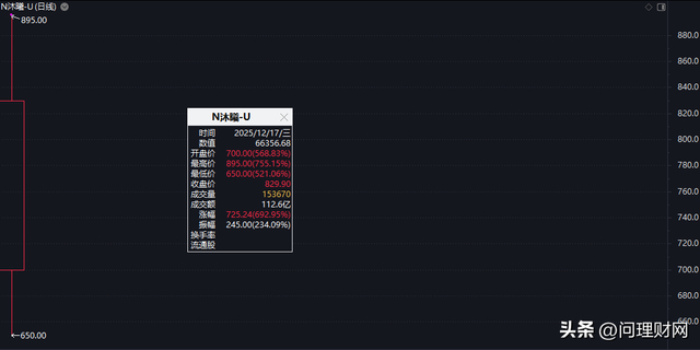 12月17日,新股N沐曦-U(688802)上市首日开盘价700元,涨幅568.83%,盘中一度涨至895元,涨幅高达755.15%,至收盘股价报收829.9元,涨幅692.9%,当日成交112.6亿元,换手率84.72%,市值3320亿元。