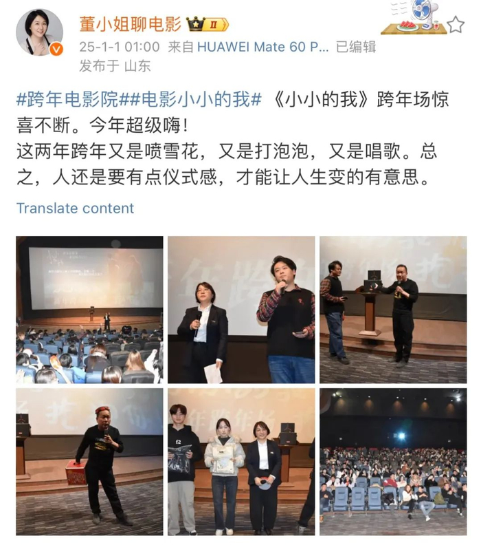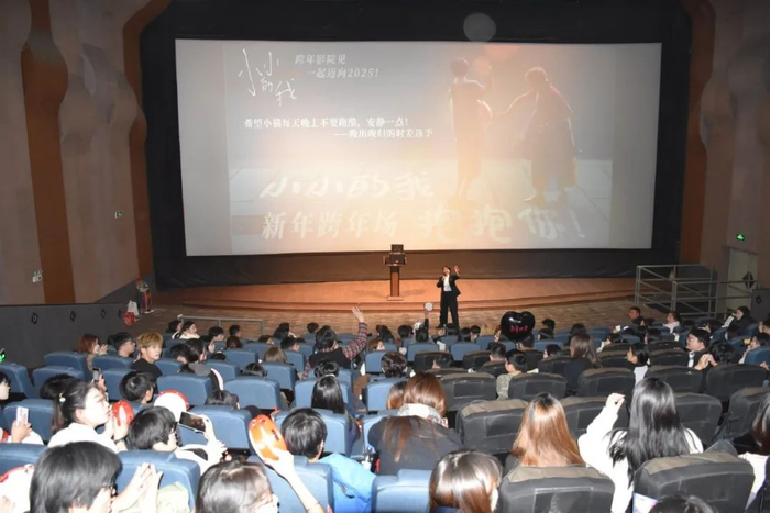 跨年是一个格外需要仪式感的时刻。当晚董小姐先是要在《“骗骗”喜欢你》映后喷泡泡,然后因为《小小的我》跨年场卖得不错,她特别为它策划了一场迷你演出——电影里有《心恋》和《干杯朋友》两首经典老歌,《小小的我》本身有一首同名老歌,她就找了一个音乐学院的男生,请他映后给观众唱这三首歌。男生年纪小,没听过这些老歌,提前认真学习了一番。排练的时候董小姐还有点担心,不知道观众会是什么反应,会不会冷场……