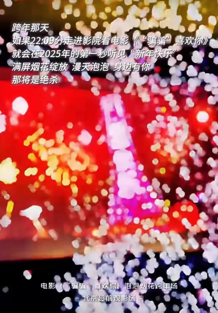 如果是看22:09开始的跨年场,你会在零点的时候看到电影里放起了烟花并打出“新年快乐”四个大字,影厅里同时也会喷出泡泡水做的“烟花”。