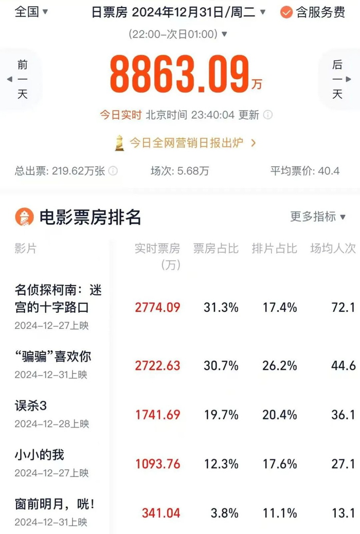去年12月31日全天大盘是7.3亿,今年跨年当天是3.8亿,看起来整体热度不如去年高,但两者其实不具备直接可比性。去年31号前后都是休息日,并且《一闪一闪亮星星》是粉丝向大IP,12月30日上映,发行策略就是全力冲跨年票房,元旦节后票房便断崖式下跌。