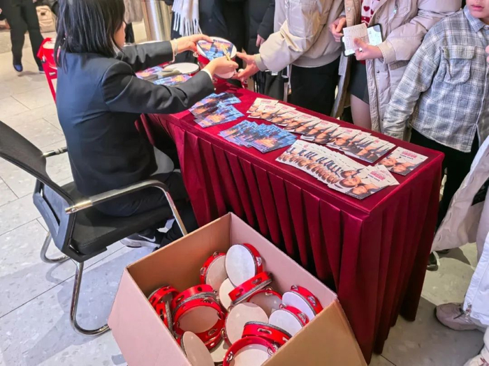 《小小的我》片方给各个影院寄了展架、车票物料和一个小鼓,供观众打卡拍照。董小姐觉得这样还不够,于是她在网上买了几十个手鼓,另外还印制了《小小的我》《“骗骗”喜欢你》的明信片,在影院里摆个台子,等买票的观众来到影院后,就叫他们来领免费礼物。