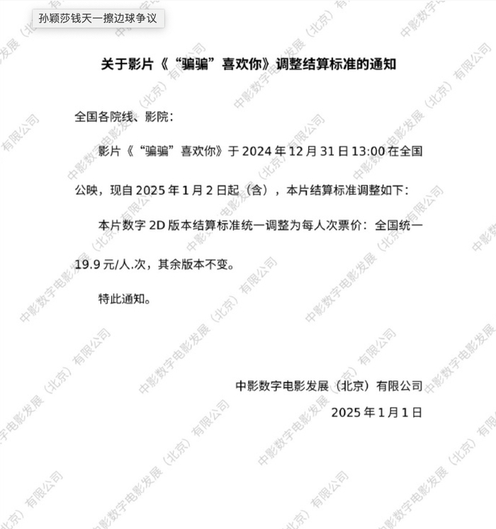 新年第一天,《“骗骗”喜欢你》和《火锅艺术家》2D版发布结算价调整通知,把发行方和影院的结算价格统一调整为19.9元(电影票价由影院自行决定,当实际票价高于结算价时,就按实际票价分账,低于结算价则需要有人补贴),之前新片结算价通常是三十四元,如此大的降幅堪称历史首次。