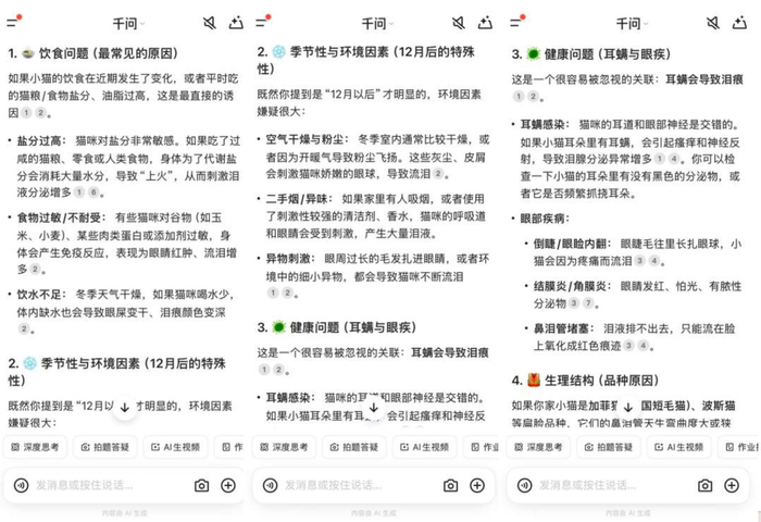 当然,我也把这道问题抛给了各大AI助手,“12月以后,小猫的泪痕变得很明显,这是什么原因?”